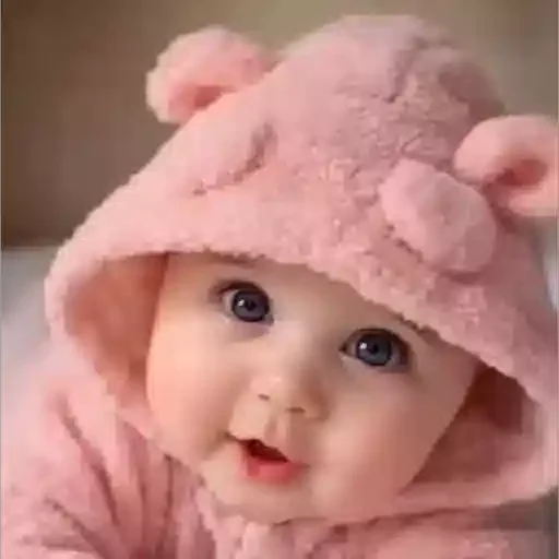 Bebê com touca rosa de ursinho, olhos azuis e boca ligeiramente aberta.