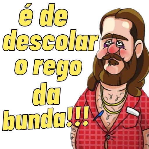 Um homem careca com bigode e barba, usando uma camisa vermelha xadrez e várias correntes, com texto amarelo que diz 'é de descolar o rego da bunda!!!'
