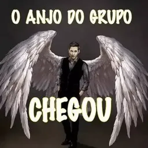 Um homem com asas de anjo e roupas pretas, com o texto 'O ANJO DO GRUPO CHEGOU' em letras grandes e brancas.