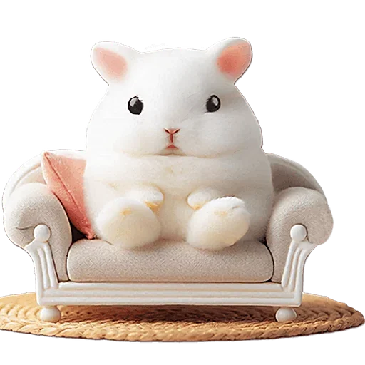 Um coelho branco fofinho sentado em um sofá bege com um travesseiro rosa. Ele tem olhos pretos e orelhas cor-de-rosa.