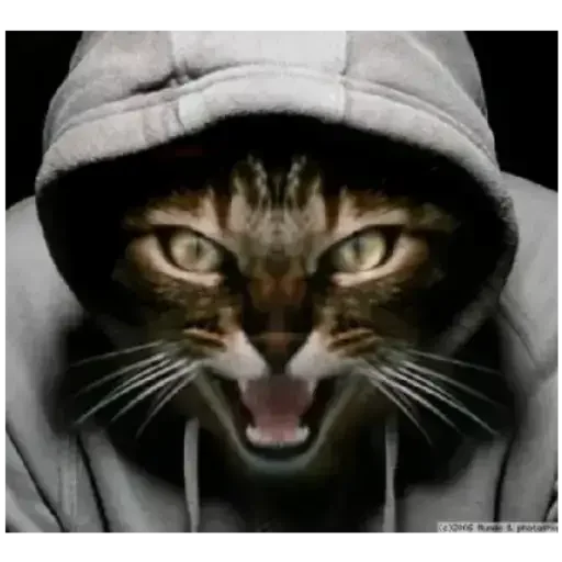 Gato com capuz, olhos verdes e boca aberta, mostrando os dentes. O fundo é preto.
