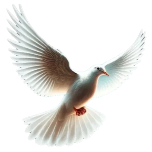 Pomba branca voando com asas abertas, penas brancas e laranja no bico e pés.