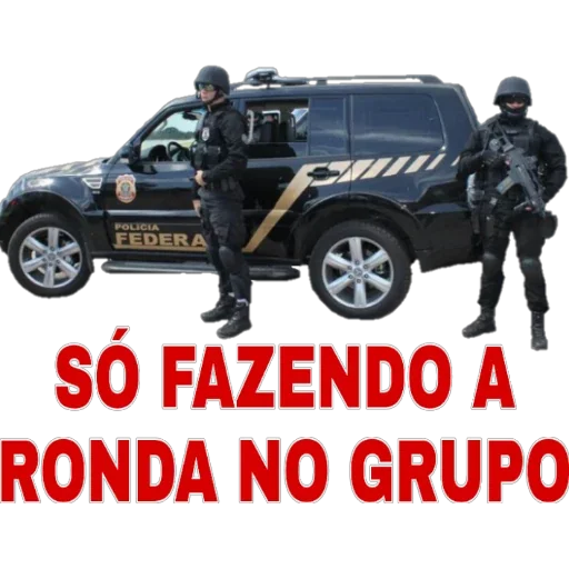 Dois policiais fardados em pé ao lado de uma viatura policial preta com a palavra 'POLÍCIA' na porta, segurando armas. Abaixo deles, a frase 'SÓ FAZENDO A RONDA NO GRUPO' em letras vermelhas.
