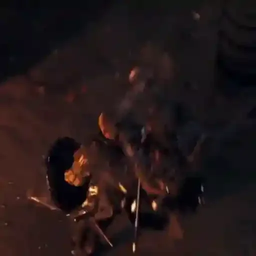 Cena noturna com uma fogueira e duas pessoas sentadas ao redor, com chamas e luzes quentes.