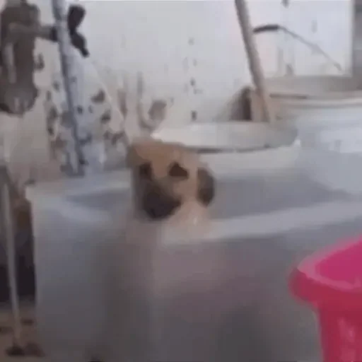 Um cachorro molhado e sujo, com expressão triste, em uma banheira com água suja e uma batedeira rosa no canto.