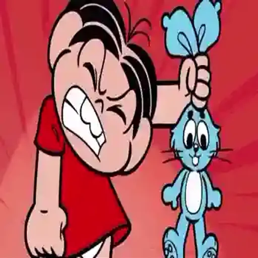 Menino de cabelo preto e camisa vermelha segura um gato azul com uma expressão de raiva, com o punho cerrado e dentes arreganhados.