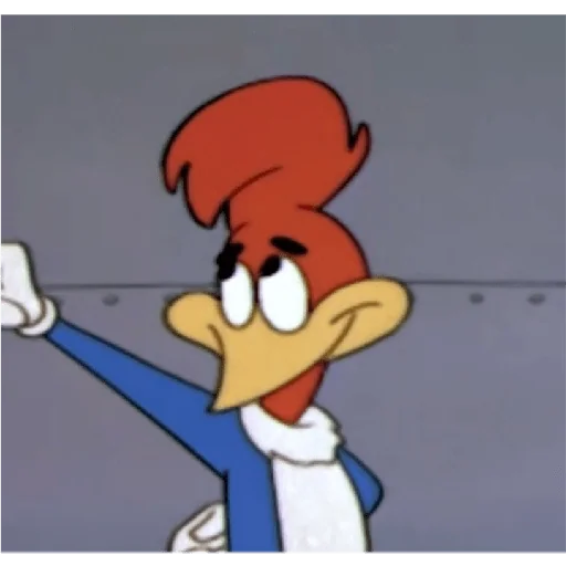 Personagem de desenho animado, pica-pau com cabelo vermelho e roupa azul, com expressão feliz e mão na parede.