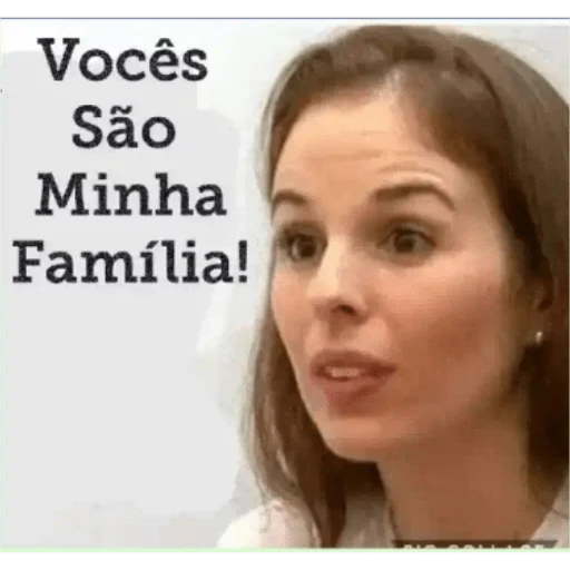 Uma mulher com cabelo castanho e expressão surpresa, com o texto 'Vocês São Minha Família!' ao lado.