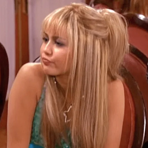 Uma jovem com cabelos castanhos e expressão de desinteresse ou tédio, vestindo uma blusa roxa.