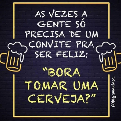 Um convite para tomar cerveja escrito em fundo preto com letras brancas e amarelas, acompanhado de dois copos de cerveja espumante desenhados.