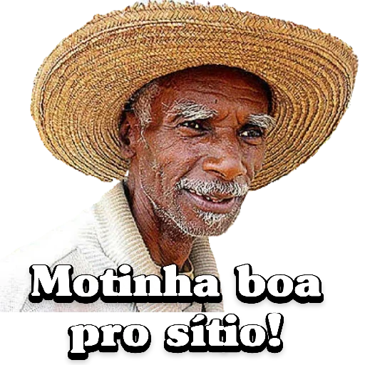 Um homem mais velho com um chapéu de palha e um olhar sério, com o texto 'Motinha boa pro sítio!' sobreposto.