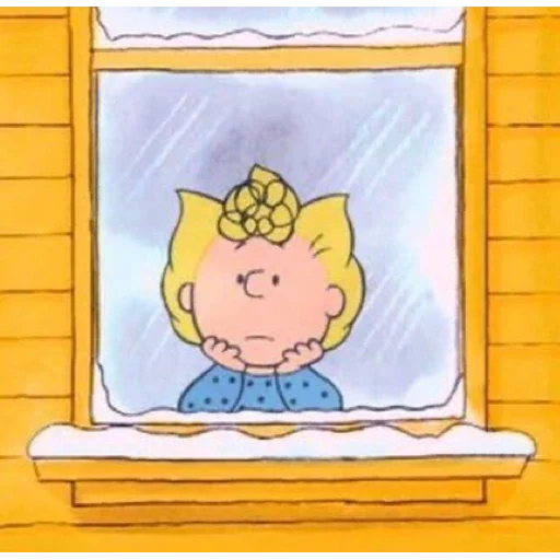 Menina loira olhando pela janela com uma expressão triste enquanto a neve cai do lado de fora.