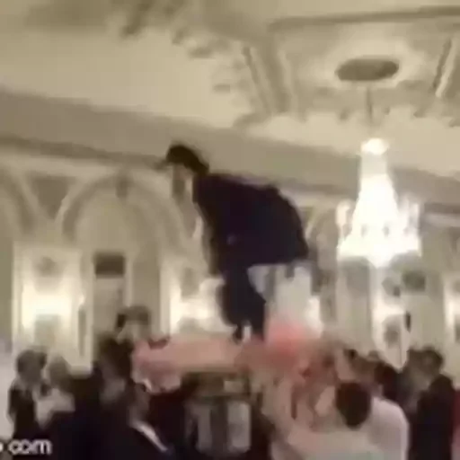 Homem vestido de preto pulando em uma mesa em um salão com pessoas ao redor, com um candelabro ao fundo e um teto decorado.