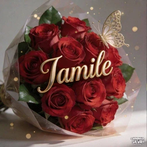 Um buquê de rosas vermelhas com o nome 'Jamile' em letras douradas no centro. Há uma borboleta dourada e folhas verdes ao redor.