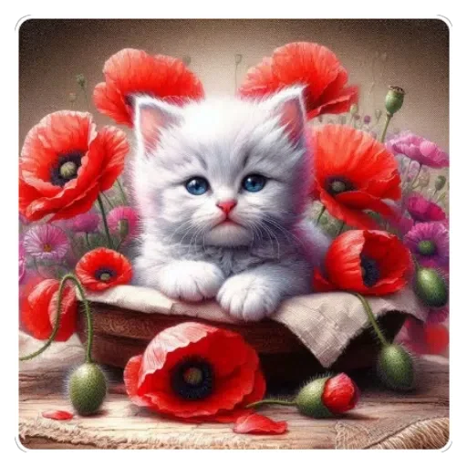 Um gatinho branco fofinho com olhos azuis senta-se em uma caixa de madeira cercada por flores de papoula vermelhas e rosadas.