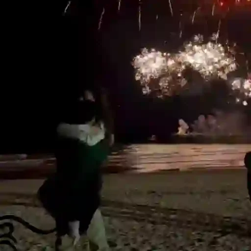 Um cachorro sentado na praia à noite, observando fogos de artifício no céu.