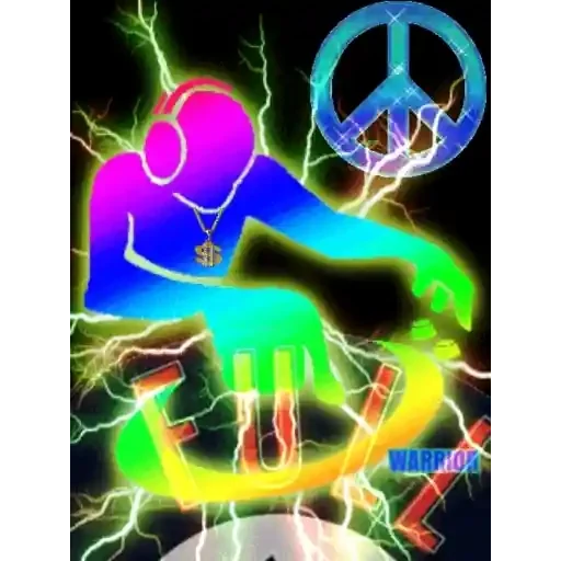 Uma figura colorida com headphones e correntes de música, cercada por raios e um símbolo de paz, com o texto 'DJ' em destaque.