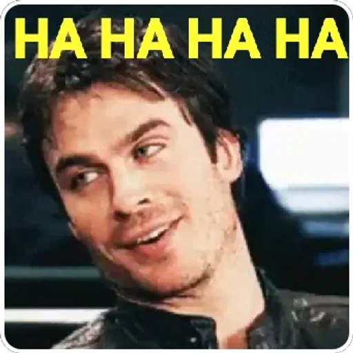 Um homem com expressão de alegria e risadas, com o texto 'HA HA HA HA' em letras amarelas acima de sua cabeça.