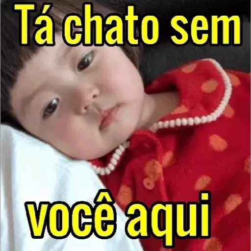 Menina com expressão triste, vestida com uma camisa vermelha com manchas laranja, com o texto 'Tá chato sem você aqui' sobreposto.