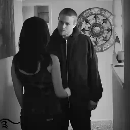 Cena em preto e branco de um homem e uma mulher em pé, próximos um do outro, em um ambiente com decoração na parede.