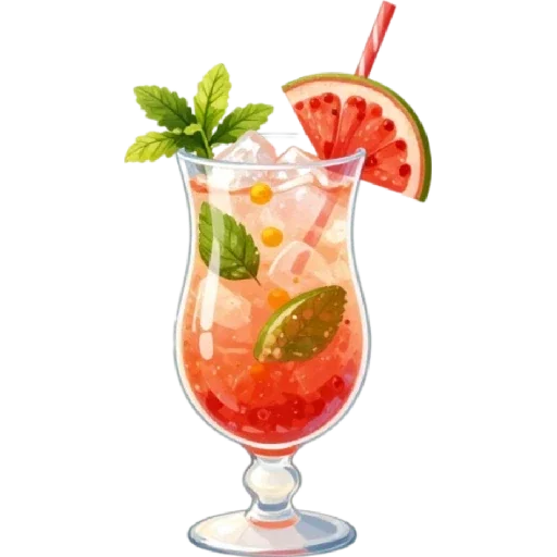 Um drinque refrescante em um copo alto, com cor-de-rosa e vermelho, gelo, folhas de hortelã, fatia de toranja e canudo.