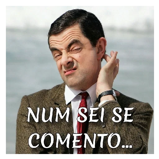 Um homem de terno castanho, com cabelo preto e bigode falso, faz uma careta enquanto segura o telefone ao ouvido. Ele está com uma expressão confusa e o texto 'NUM SEI SE COMENTO...' aparece na imagem.
