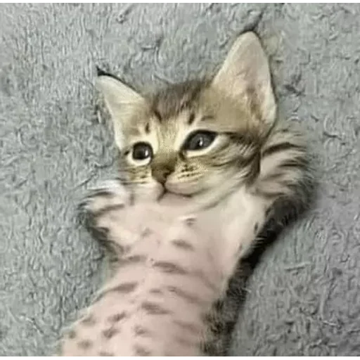 Um gatinho cinza e branco com olhos grandes e orelhas pontiagudas, deitado de lado em uma superfície cinza.