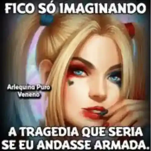 Uma ilustração de Harley Quinn com cabelo loiro e maquiagem colorida, com texto 'FICO SÓ IMAGINANDO A TRAGÉDIA QUE SERIA SE EU ANDASSE ARMADA.'