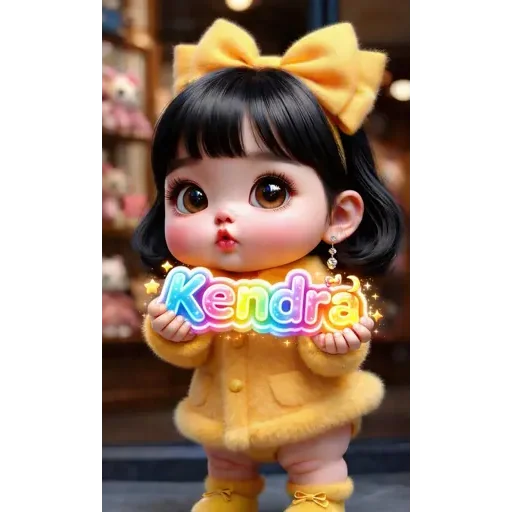 Menina de cabelo preto com franja e um laço amarelo na cabeça, vestindo um conjunto amarelo, segura uma placa com o nome 'Kendra' colorido.
