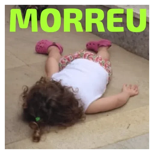 Menina deitada no chão com as pernas afastadas, vestindo uma blusa branca e sandálias rosa. A palavra 'MORREU' está escrita em letras grandes e verdes acima dela.
