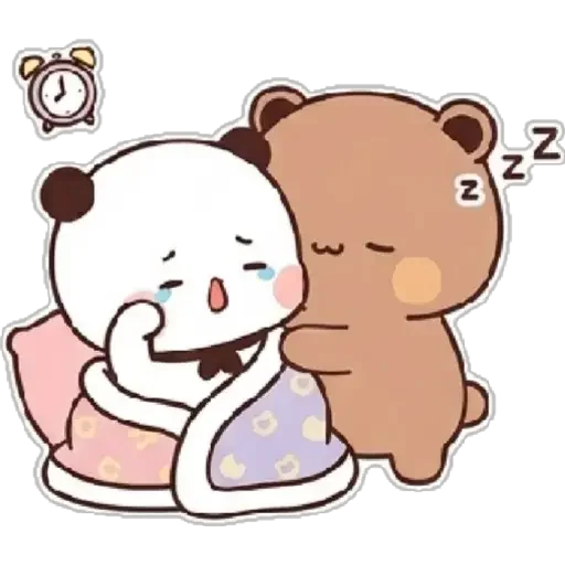 Um urso pardo e um urso branco fofos estão abraçados, ambos com expressão de sono. O urso branco está com a mão na boca e o urso pardo tem 'z z z' saindo de sua cabeça.
