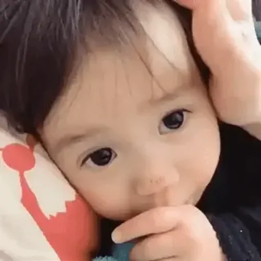 Um bebê com cabelo preto e olhos castanhos, apoiado em um travesseiro vermelho e branco, com a mão na boca e a outra mão no cabelo.