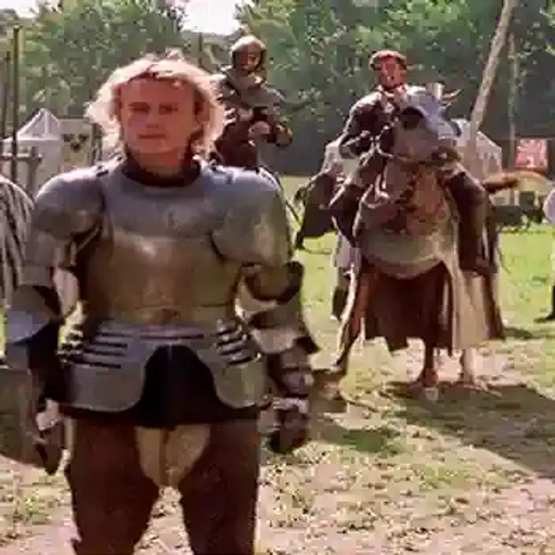 Cena de um filme ou série medieval com um homem de armadura de metal prateado à frente, com cabelos claros, e dois cavaleiros a cavalo ao fundo, em um ambiente campestre com árvores e tendas.