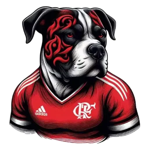 Um cão com um design de rosto vermelho e preto, usando uma camisa vermelha com listras brancas e o logo do CR7.