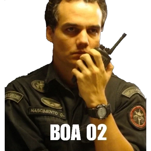 Um homem com uniforme de policial ou militar, com um rádio na mão, olhando para frente com expressão séria. Há um texto 'BOA 02' em branco na parte inferior.