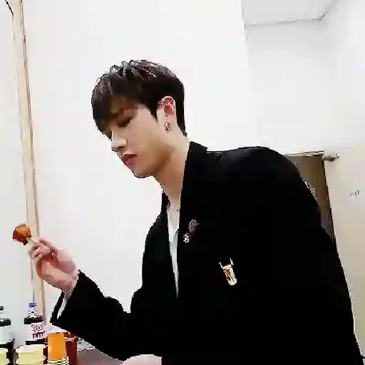 Um jovem com cabelo preto e jaqueta preta segurando um objeto pequeno na mão esquerda.
