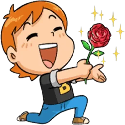 Menino cartoon com cabelo laranja oferecendo uma rosa vermelha com folhas verdes, sorrindo com olhos fechados e estrelas douradas ao redor.