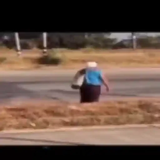 Uma pessoa idosa, com um chapéu branco e uma camisa azul, caminhando sozinha em uma estrada com vegetação seca ao redor.