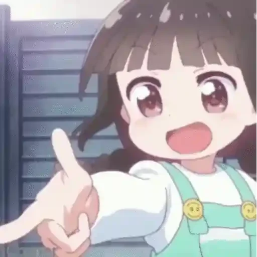 Garota de anime com franja e macacão verde aponta para o lado com um sorriso surpreso no rosto.