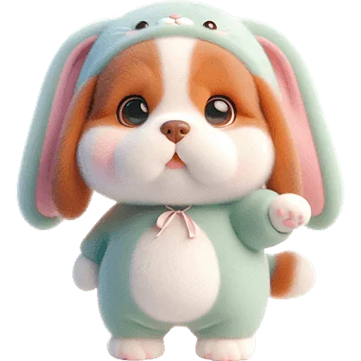 Um cachorro fofinho vestido com um macacão de coelho verde claro com orelhas rosa e azuis, com olhos grandes e expressivos.