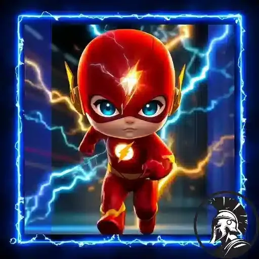 Personagem de Flash em estilo cartoon, com traços infantis, usando um traje vermelho e máscara, com raios azuis e amarelos ao fundo.