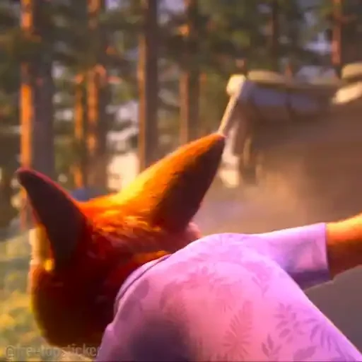 Um desenho de uma raposa com orelhas grandes e um corpo laranja, vestindo uma camisa roxa, em um ambiente de floresta.