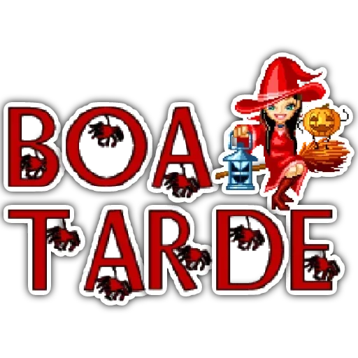 Uma bruxa de chapéu vermelho sentada em uma vassoura, segurando um bule, ao lado das letras 'BOA TARDE' em vermelho com formigas pretas.