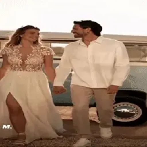 Um casal feliz, com a mulher vestida em um longo vestido branco com detalhes em renda e o homem de camisa branca e calça bege, caminhando em frente a uma van.