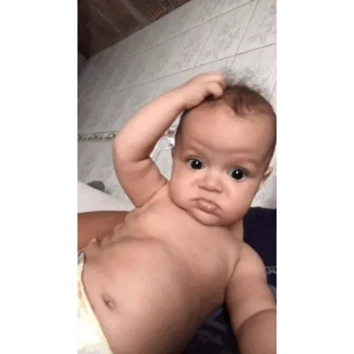 Um bebê sem camisa, com a mão no cabelo e uma expressão pensativa no rosto.