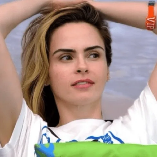 Mulher com as mãos no cabelo, parecendo confusa ou surpresa, usando uma camiseta branca com texto azul e pulseira laranja.