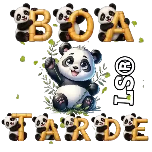 Um urso panda fofinho com as palavras 'BOA TARDE' em letras grandes e douradas ao redor, com pequenos pandas nas letras.