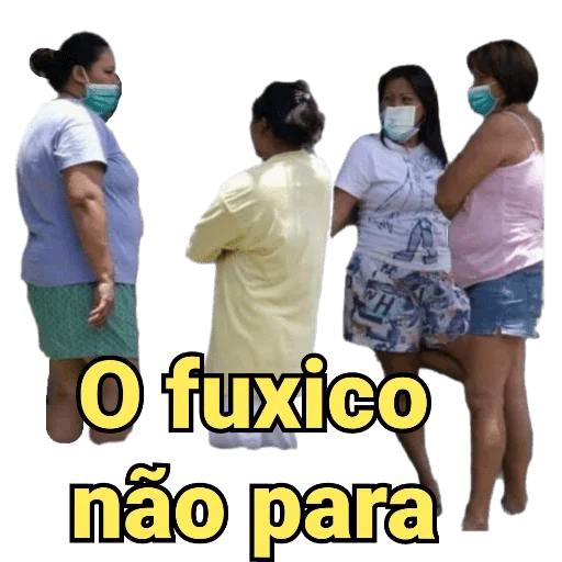 Quatro mulheres obesas usando máscaras faciais e conversando. A imagem traz o texto "O fuxico não para" em letras amarelas.