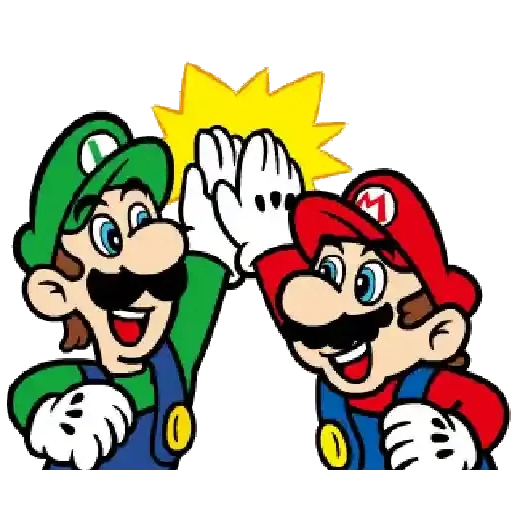 Dois personagens de videogame, Mario e Luigi, sorrindo e fazendo um gesto de celebração com as mãos, com uma explosão amarela ao fundo.
