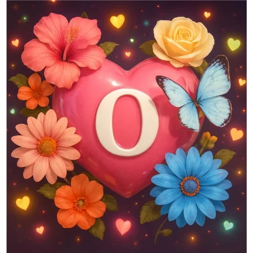 Um coração rosa com a letra 'O' no centro, rodeado de flores coloridas, incluindo rosa, laranja, azul e rosa, e um borboleta azul, com corações e luzes ao fundo.